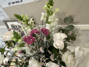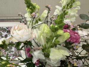 スプレーバラが美しいですね!白が透き通っていて、うっすらした綺麗なピンクのおかげでその透明感が増している感じです。ぼんやり眺めていると本当に癒されます…そしてもう一つの綺麗な白いお花がスナップ レジェスノーです。スナップ、は金魚草のことなんですねぇ。シュッとしていて、でもふわふわのかわいさ。