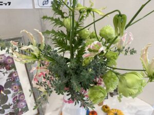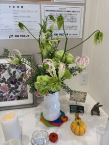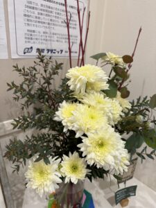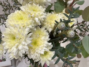 綺麗な淡い黄色のお花は菊ですよ!スプレーマムの、その名もシャンパンアイボリー。美しい色味ですよねぇ…何を連想するかな?とピンときたのが霜、でした。あのパリサク、しゃりしゃり感とそんな朝の晴れて高く透き通った空さえ連想させてくれます。