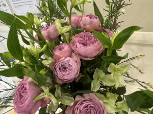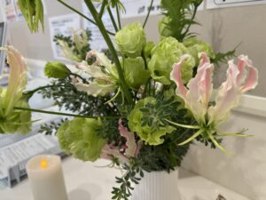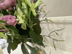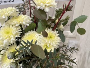 密やかに、やはり銀色がかったカラーでアクセントになっているのがリューカデンドロ トータムです。アクセントといえば、この赤い枝は…?サンゴミズキです!パッと目を引く赤ですよね。少しユーカリの葉の裏が赤みがかっていたりするので、お花全体との相性もとても良いですね。