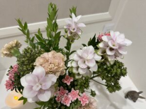 ピンク色の粒々が綺麗な植物は、ネベリアです。クラスタースターという鮮やかな名前。星の集まりということかしら。かわいいですね!