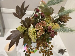 紅葉した木苺もとても素敵な雰囲気を演出しています!夕暮れ感いっぱいです。野バラの実もこれまた、真っ赤ではなくちょっと褪せた感じの橙色がたまりません。